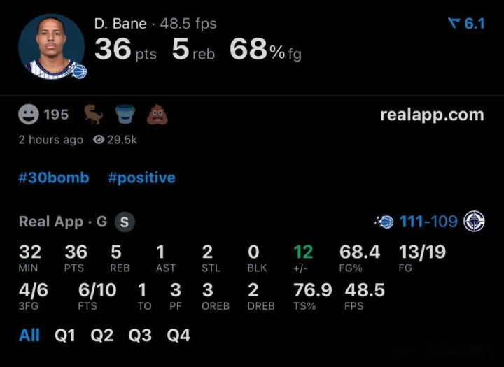 贝恩打了32分钟,19投13中,3分球6投4中,拿到了36分5板1助2断 。