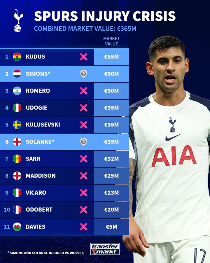 德转统计了热刺当下的伤病名单,其总身价达3.65亿。而热刺总队的身价为8.02亿: