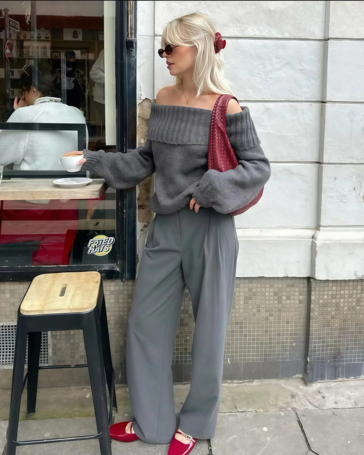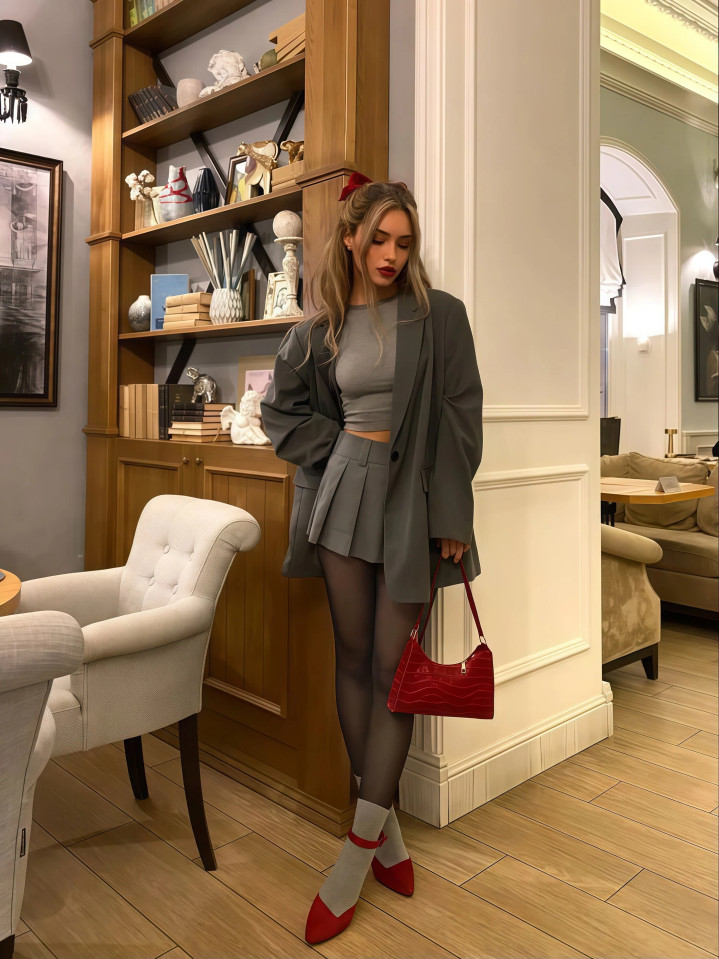 你仔细去看那些穿灰色穿得越过好意思瞻念的东说念主,她们身上一定不是重新灰到脚的,而是在一大片灰色里头,藏了一个神采显着的“小手脚”,可能是一只酒红色的包、一对红色的尖头鞋、一件粉色的内搭,就这样少许彩色,质感就跟纯灰色拉开了档次。