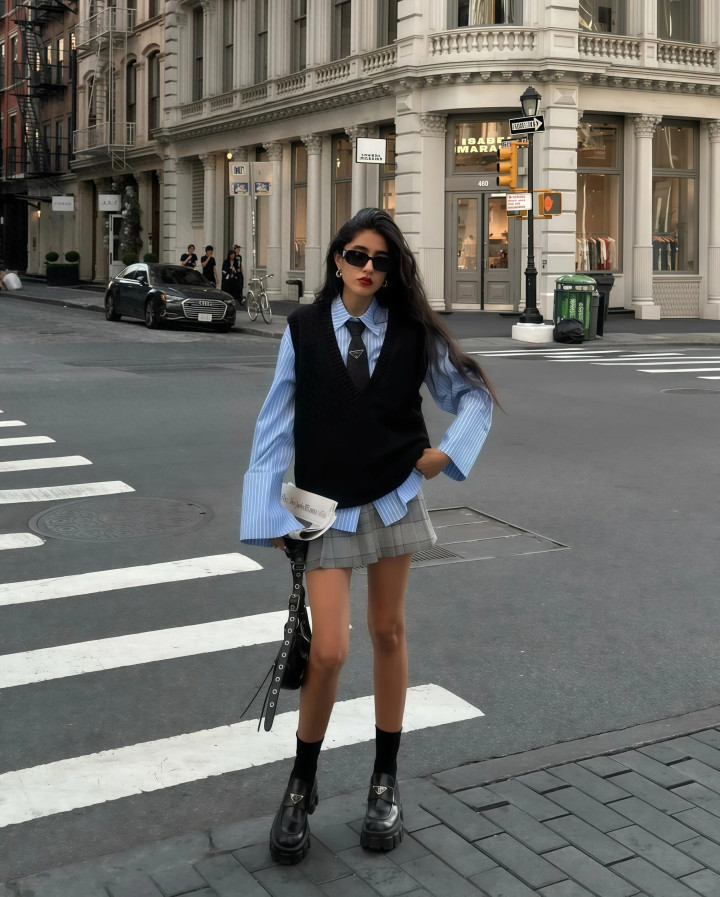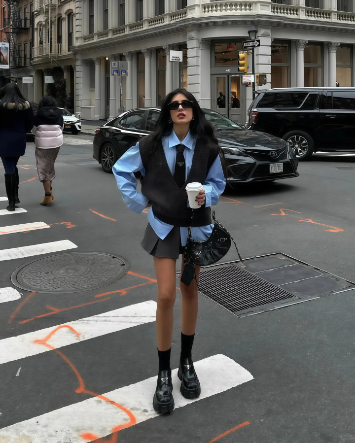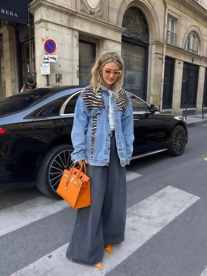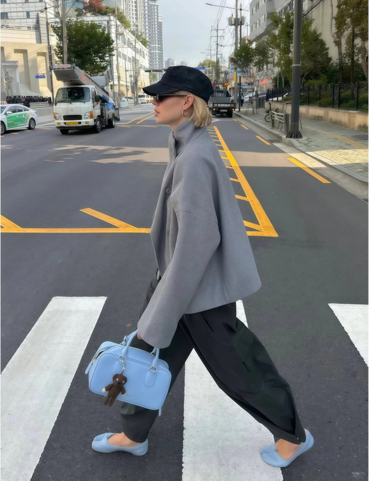 若是你念念让彩色在整套灰色穿搭里显得更“有组织”,最简便的作念法即是让鞋子和包包的神采一致,比如齐是浅蓝色,这样你身上的彩色就不是随即出现的一个点,而是从上到下有了一条呼应的线,灰色大面积铺底,蓝色在鞋子和包包上首尾呼应,整套搭配看着就很完竣、很贬抑。