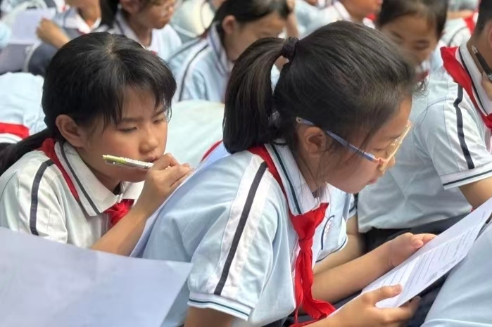 同学们以笔寄情、现场创作,将敬仰与追想念凝练就诗行,用童真笔触请安先烈、礼赞故国。一句句诗句发自心田,一声声朗读饱含深情,红色基因在诗意中扎根,创新精神在少年心中传承。