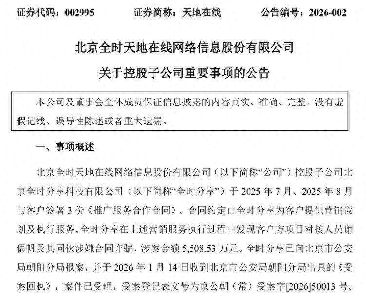 1月14日,世界在线(002995)发布公告,公司的控股子公司北京全技艺享科技有限公司与客户签署3份实验干事和谐协议。全技艺享在营销服求实行过程中发现客户方神色对接东谈主员谢偲帆过甚同伙涉嫌协议糊弄,涉案金额5509万元。