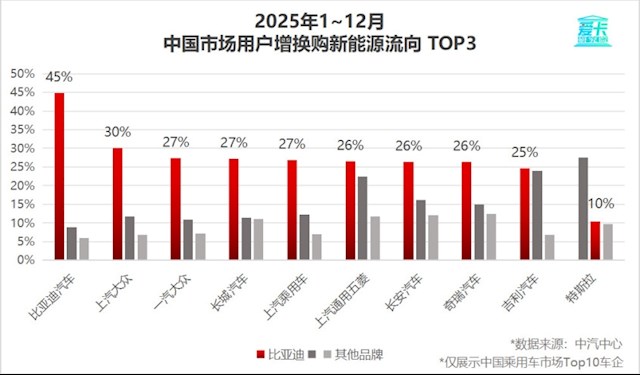 在国内乘用车市集TOP 10车企用户中,平均每4个增换购新动力的用户里,就有1个投向了比亚迪。