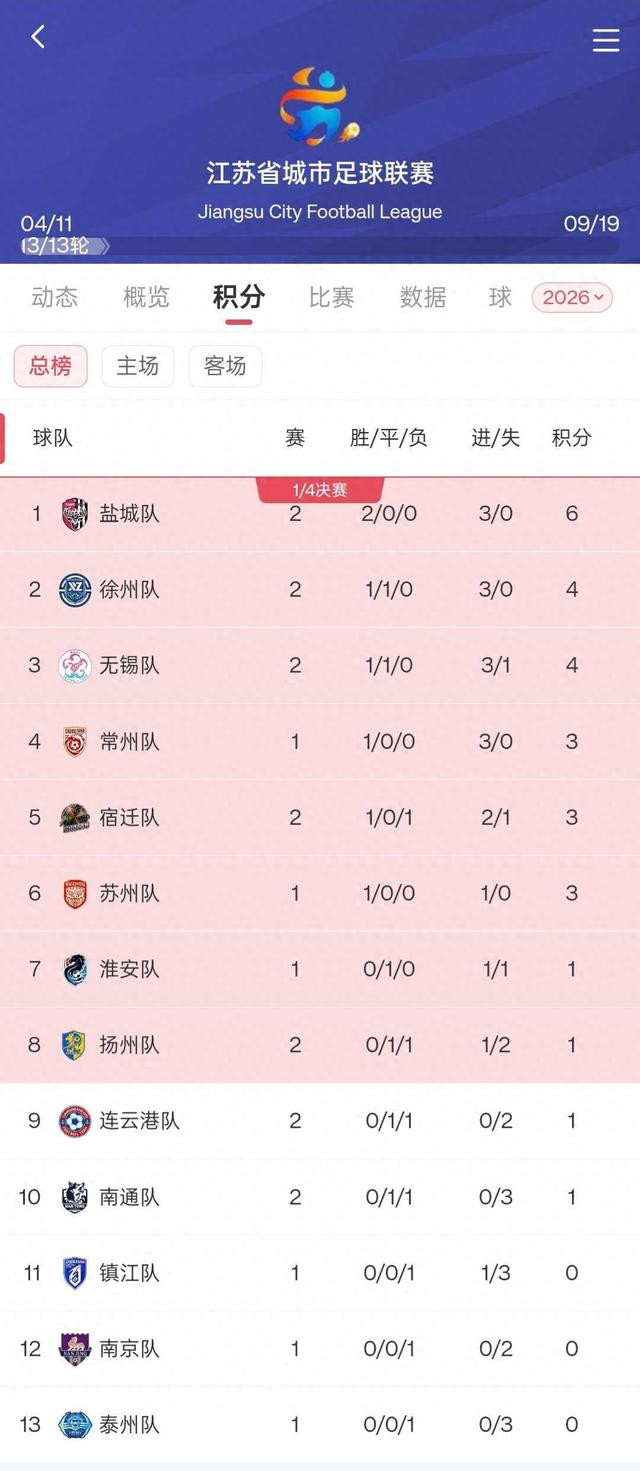 在积分榜上紧随后来的是徐州队和无锡队。这两支队列现在均得到了1胜1平的战绩,同积4分,分裂暂列第二和第三位。常州队现在少赛一轮,以1战全胜积3分位列第四;而在此前刚刚与盐城队演出过热烈交锋的宿迁队,现在以1胜1负积3分的收成暂列第五名。