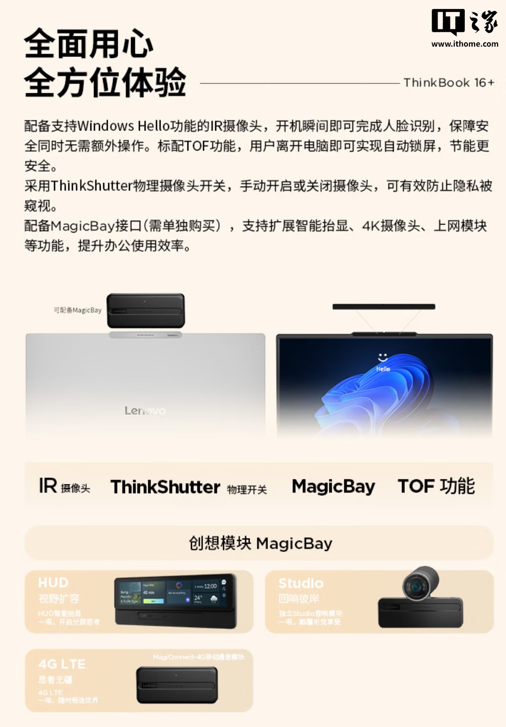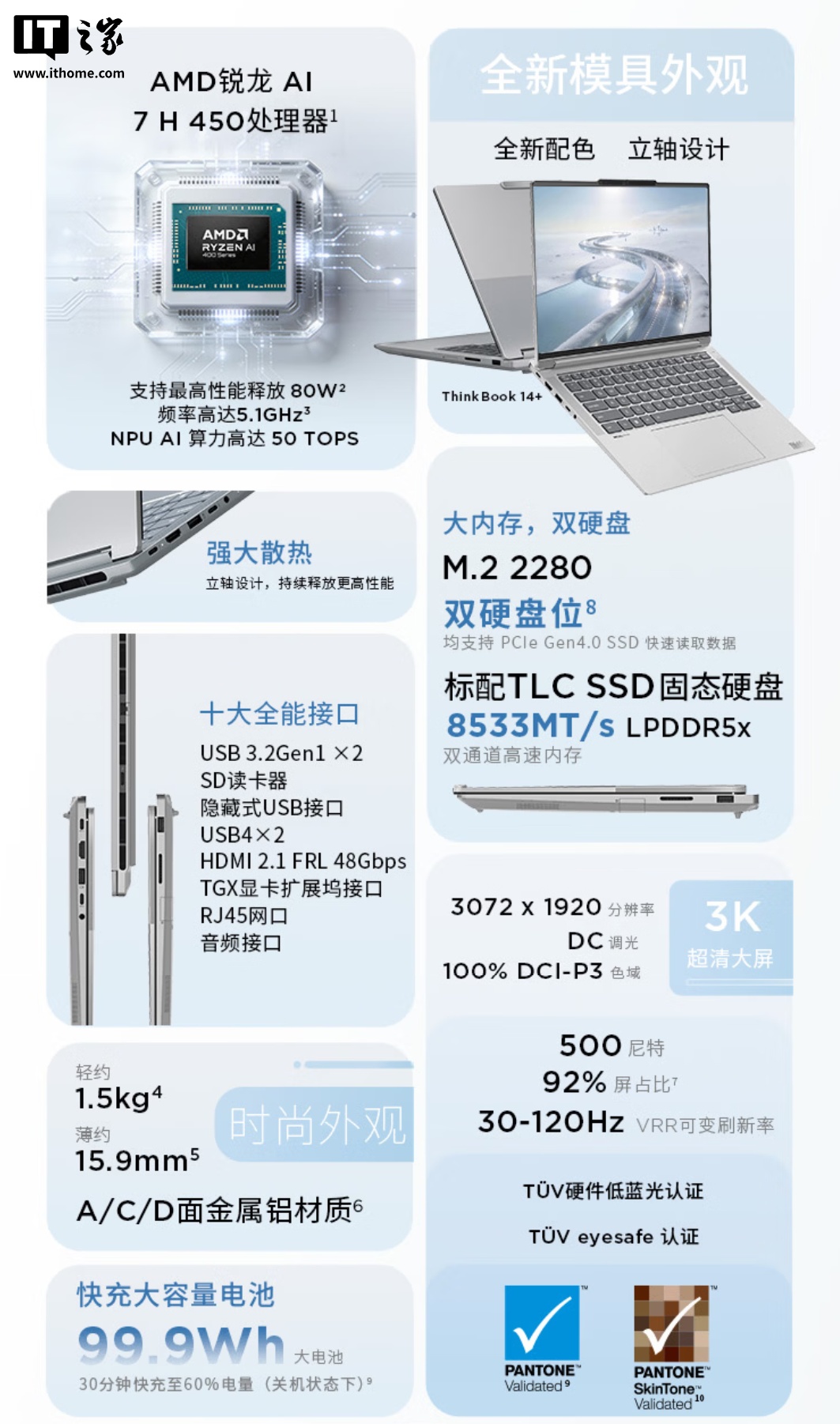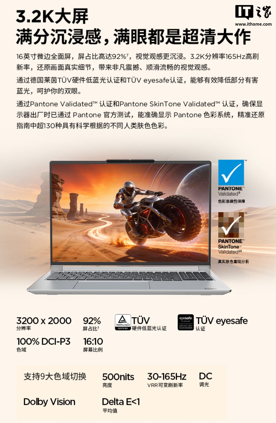 Think Book 16+ 锐龙版:这款札记本的管制器参数与 14+ 相通,不外最高性能开释栽培至 83W,补助 180° 开合,搭载 16 英寸 3.2K 大屏,分辨率可达 3200*2000,补助 165Hz 高刷,掩盖 100% DCI-P3 色域,通过德国莱茵 TUV 硬件低蓝光认证。