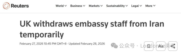 英外洋交部周五(2月27日)暗示,由于中东地区安全场面病笃,已暂时从伊朗除掉职责主谈主员,并关闭驻德黑兰的英国驻伊朗大使馆,改为辛勤运作。