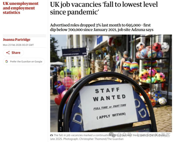 英国招聘网站Adzuna的数据走漏,2026年1月英国正在招聘的职位数目下落3%,降至69.5万个。这是自2021年1月以来,职位空白数目初次跌破70万个。