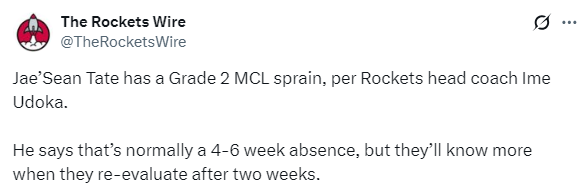 北京技术2月24日,NBA通例赛继续进行,火箭球员泰特的伤情出炉,火箭主扶助乌度卡显露,泰特遭受二级内侧副韧带扭伤,这常常意味着需要休战4-6 周,但火箭将在两周后重新评估他的伤情。