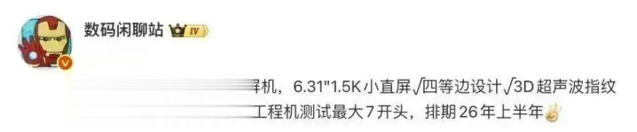 在此之前,这位博主的音讯中也提到过这款新机,定位骁龙8E5性能小屏机,6.31"1.5K小直屏,四等边计算,3D超声波指纹,IP68,工程机测试最大7开始电板。