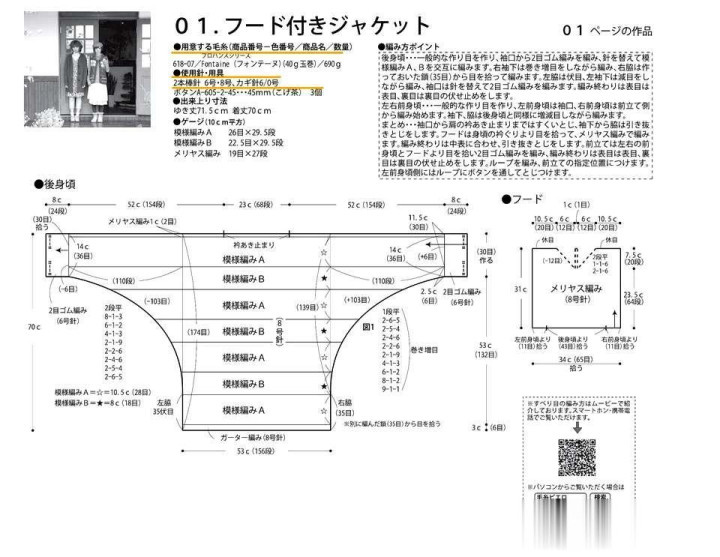 其他:从袖口织到肩部袖长止点后,袖下到侧缝用引拔针缝合。帽子从身片的袖长止点处挑针,用平针编织。编织为止时正面相对叠合,用引拔针缝合。前襟从左、右前身片和帽子处挑针,织单罗纹针,编织为止时下针按上针形态收针,上针按下针形态收针。编织扣袢,固定在前襟的指定位置。左前身片侧通过扣袢扣上纽扣。