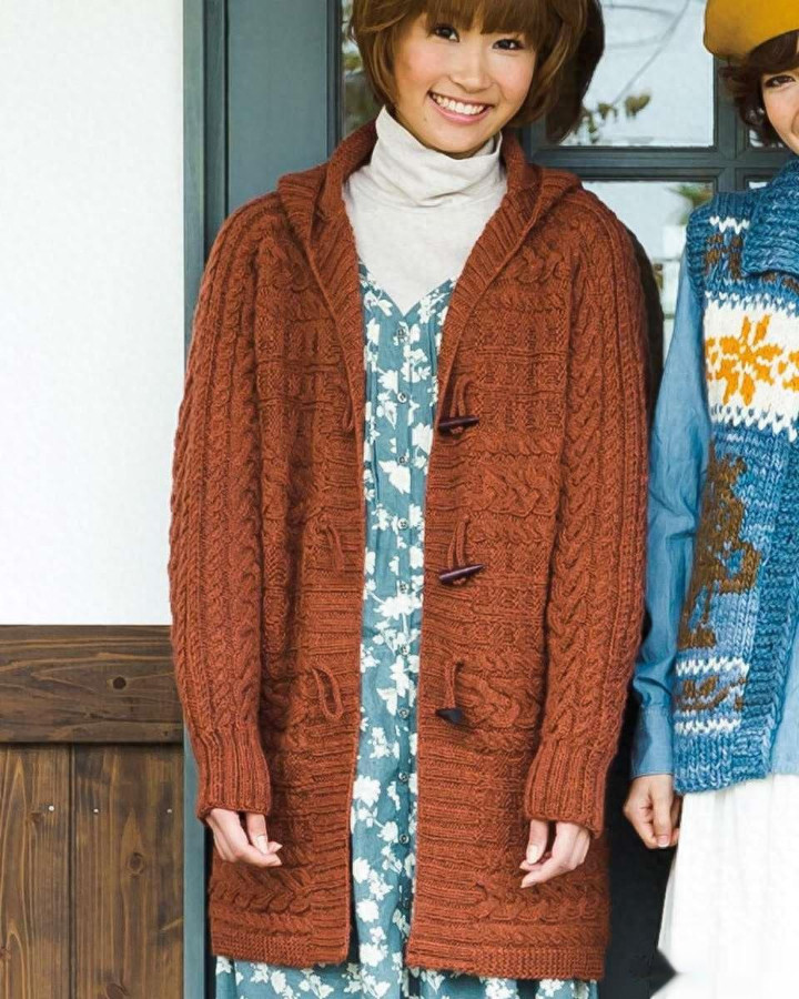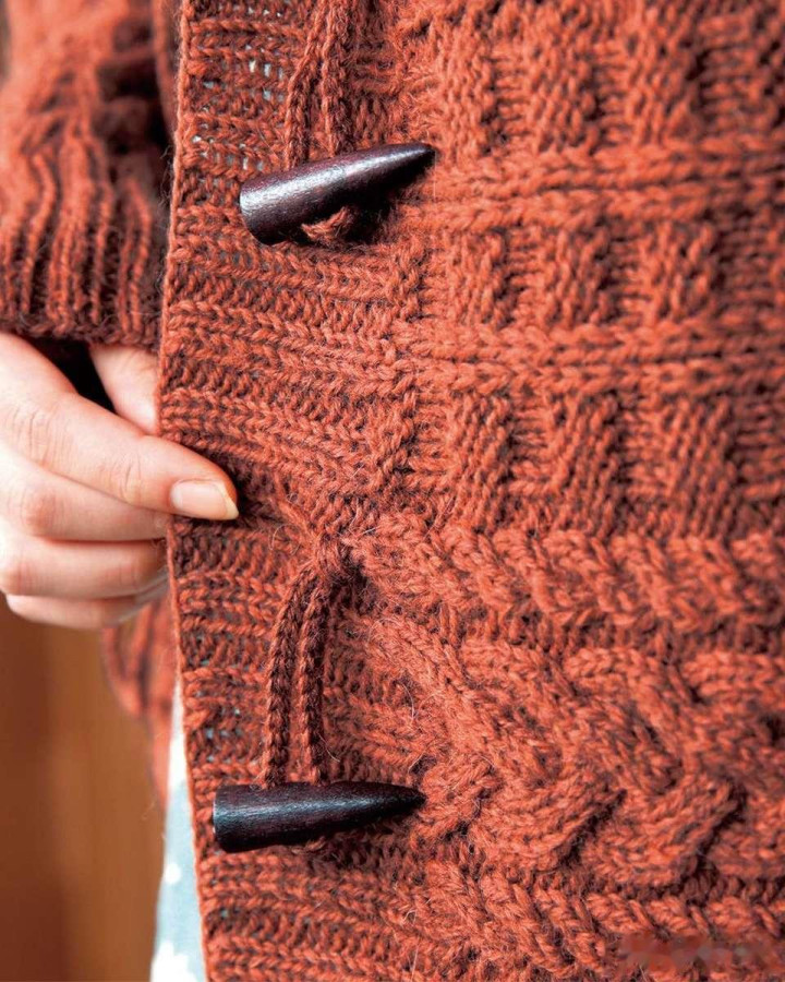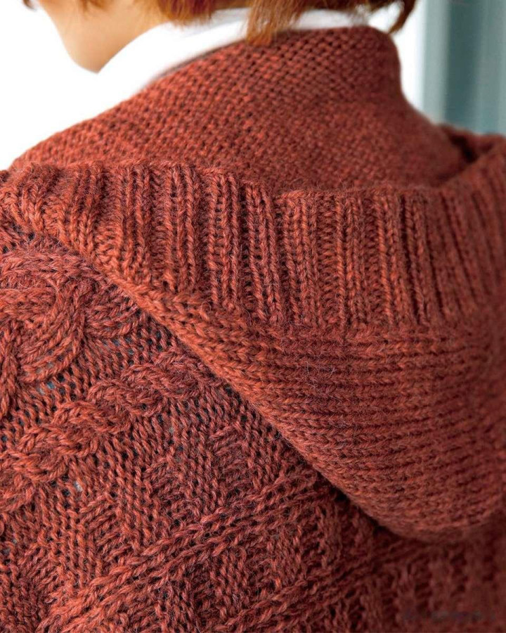 连帽开衫外衣,单侧横向袖口起织,前襟单排扣,全身麻花肌理,连帽与衣身当然衔尾