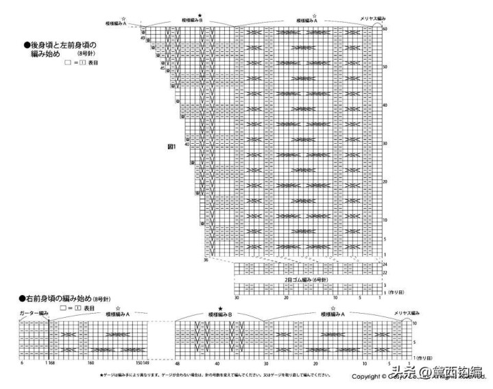 密度(10厘米见方)形态编织 A 26针×29.5行形态编织 B 22.5针×29.5行平针编织 19针×27行