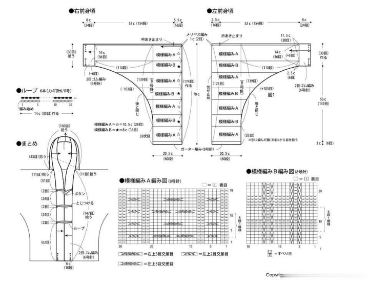 后身片:用鄙俚起针法起针,从袖口开动织单罗纹针,换针后横向编织,轮换编织形态A和B。右袖下部分边织边用卷针加针,右肩从事先作念好的(35针)中挑出针目进行编织。左肩收针,左袖下部分边织边减针,袖口换诚实单罗纹针。编织为止时,下针按上针形态收针,上针按下针形态收针。