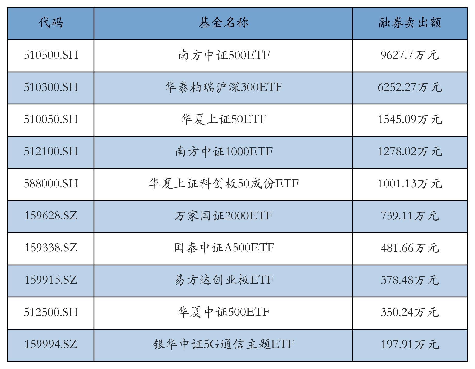 1月14日ETF融券卖出额前三位辞别为:南边中证500ETF(9627.7万元)、华泰柏瑞沪深300ETF(6252.27万元)和中原上证50ETF(1545.09万元),前10具体见下表: