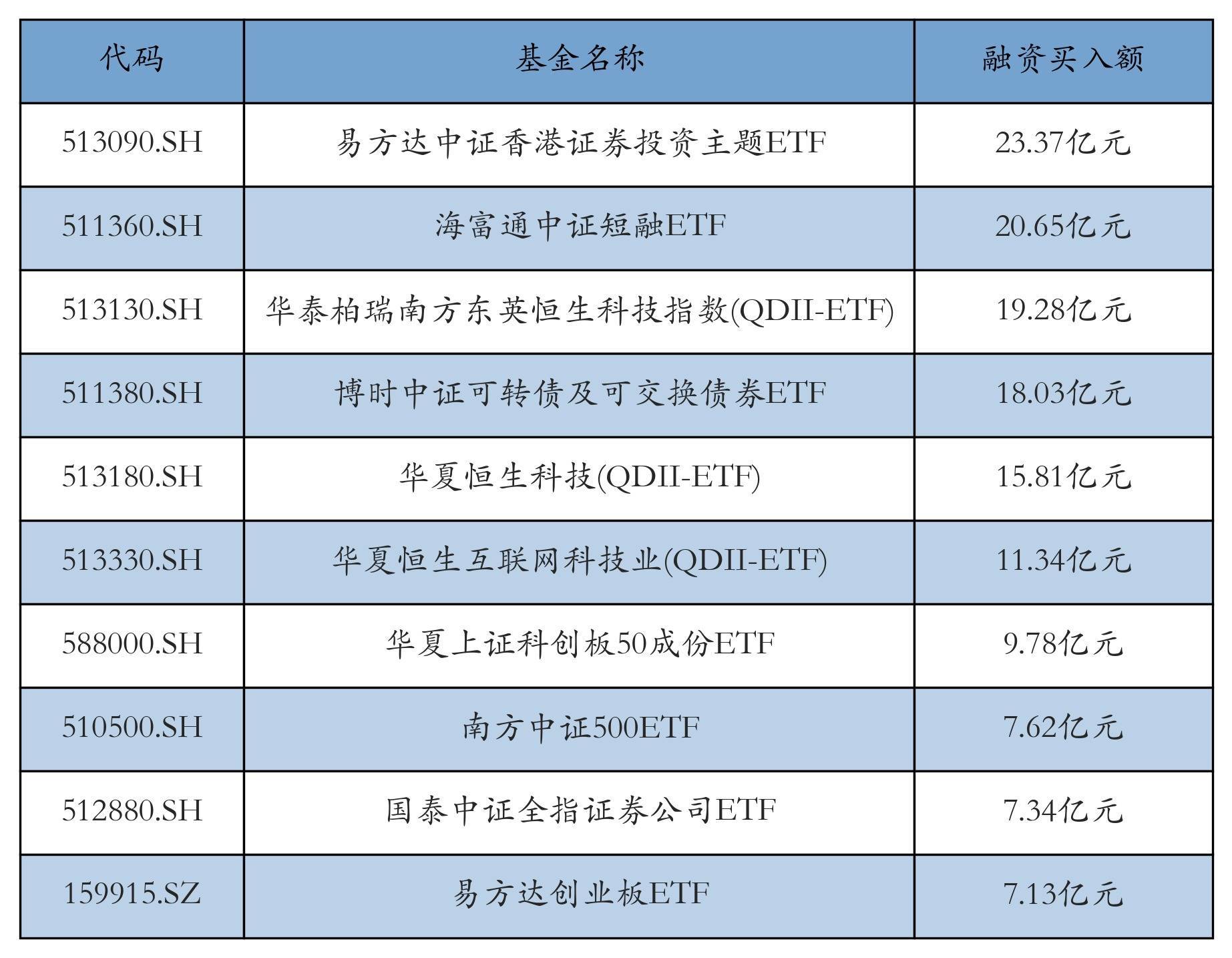 1月14日ETF融资买入额前三位辞别为:易方达中证香港证券投资主题ETF(23.37亿元)、海富通中证短融ETF(20.65亿元)和华泰柏瑞南边东英恒生科技指数(QDII-ETF)(19.28亿元),前10具体见下表: