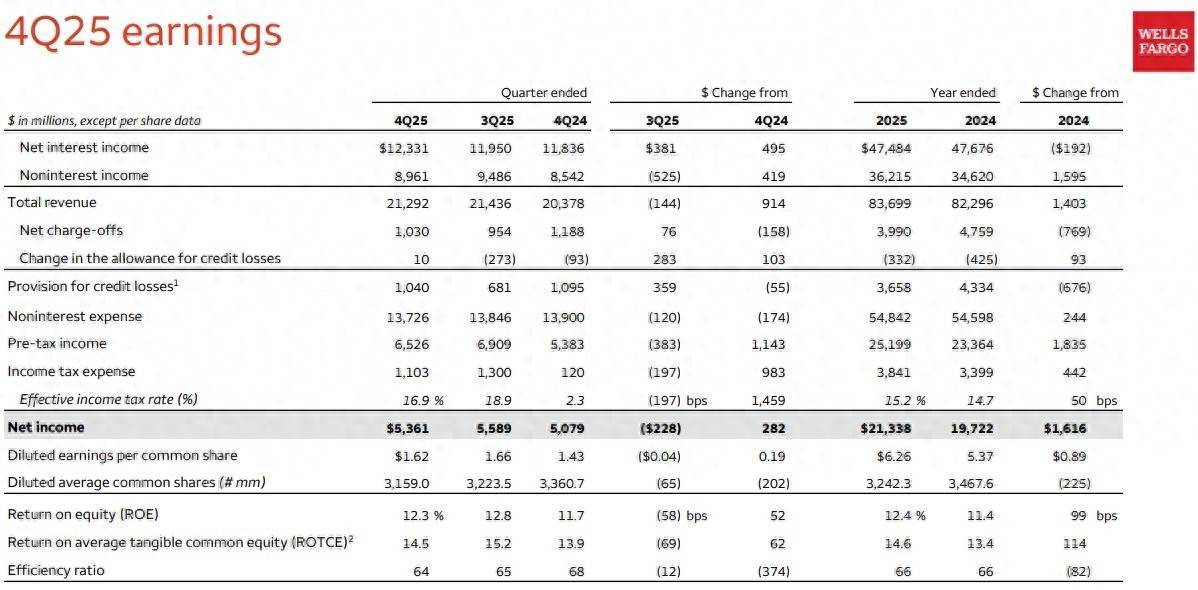 智通财经APP获悉,富国银行(WFC.US)公布了第四季度财务事迹。数据表现,Q4营收为212.9亿好意思元,同比增长4%,略低于华尔街预期的216亿好意思元。Q4非GAAP每股收益为1.76好意思元,高于阛阓预期的1.69好意思元。富国银行2025年净利润达到213亿好意思元,而分析师此前量度为 216 亿好意思元。