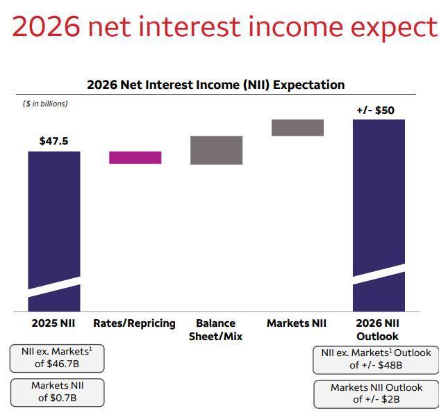 该季度净利息收入(NII)为123.3亿好意思元,同比增长4%,低于分析师预测的124亿好意思元,这是贷款业务的主要利润开头。这使得全年净利息收入达到475亿好意思元,接近其此前预测的2025年净利息收入与2024年基本捏平。Q4非利息收入为 89.6 亿好意思元,同比增长5%。