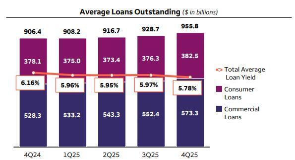 2025年第四季度平均贷款额为 9558 亿好意思元,高于第三季度的 9287 亿好意思元。平均入款额从上一季度的 1.34 万亿好意思元增至 1.38 万亿好意思元。