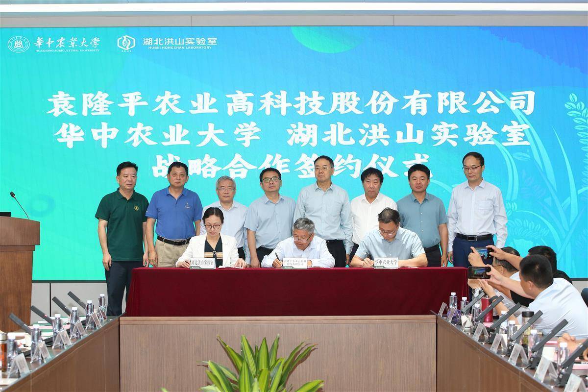 华中农业大学李一博教会团队找到水稻抗高温要津基因开关,2025年4月,华中农大、湖北洪山实验室与多家国内龙头企业现场签约(通信员蒋朝常摄)