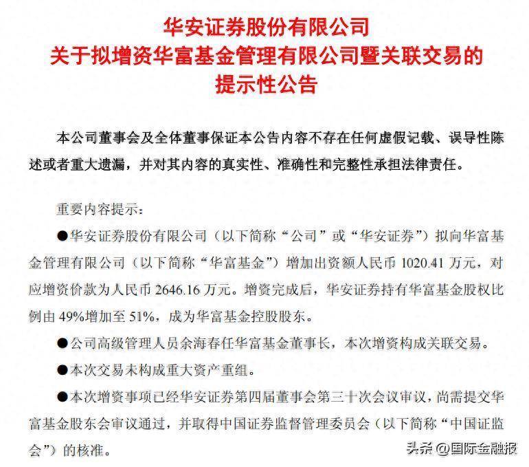 1月12日晚,华安证券发布公告,拟向华富基金加多出资额1020.41万元,对应增资价款为2646.16万元。增资完成后,其持有华富基金股权的比例将由49%增至51%,负责成为这家千亿限度公募的控股鼓舞。